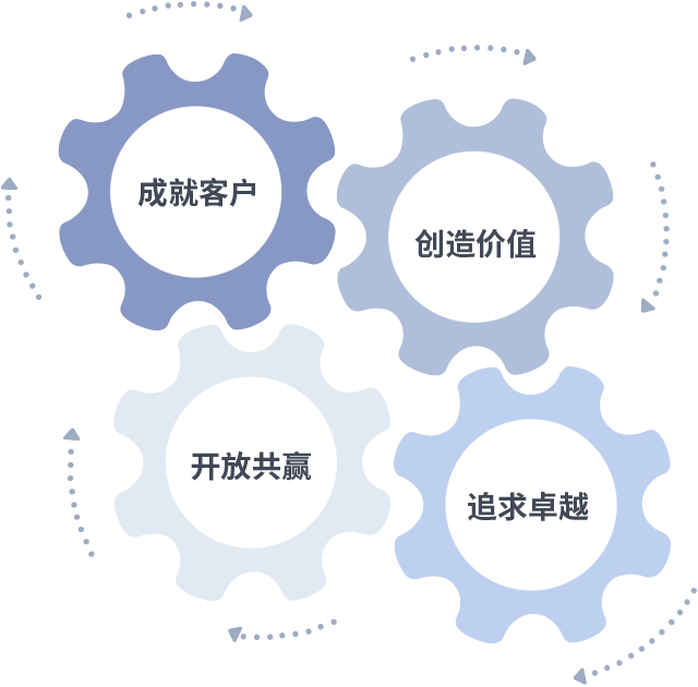 成就客户是一切决策的出发点,创造价值是衡量所有工作的标准,追求卓越是云顶集团做事做人的态度,开放共赢是云顶集团的格局也是最终的结果。价值观的齿轮环环相扣,推动着组织里的每个人不断向前。